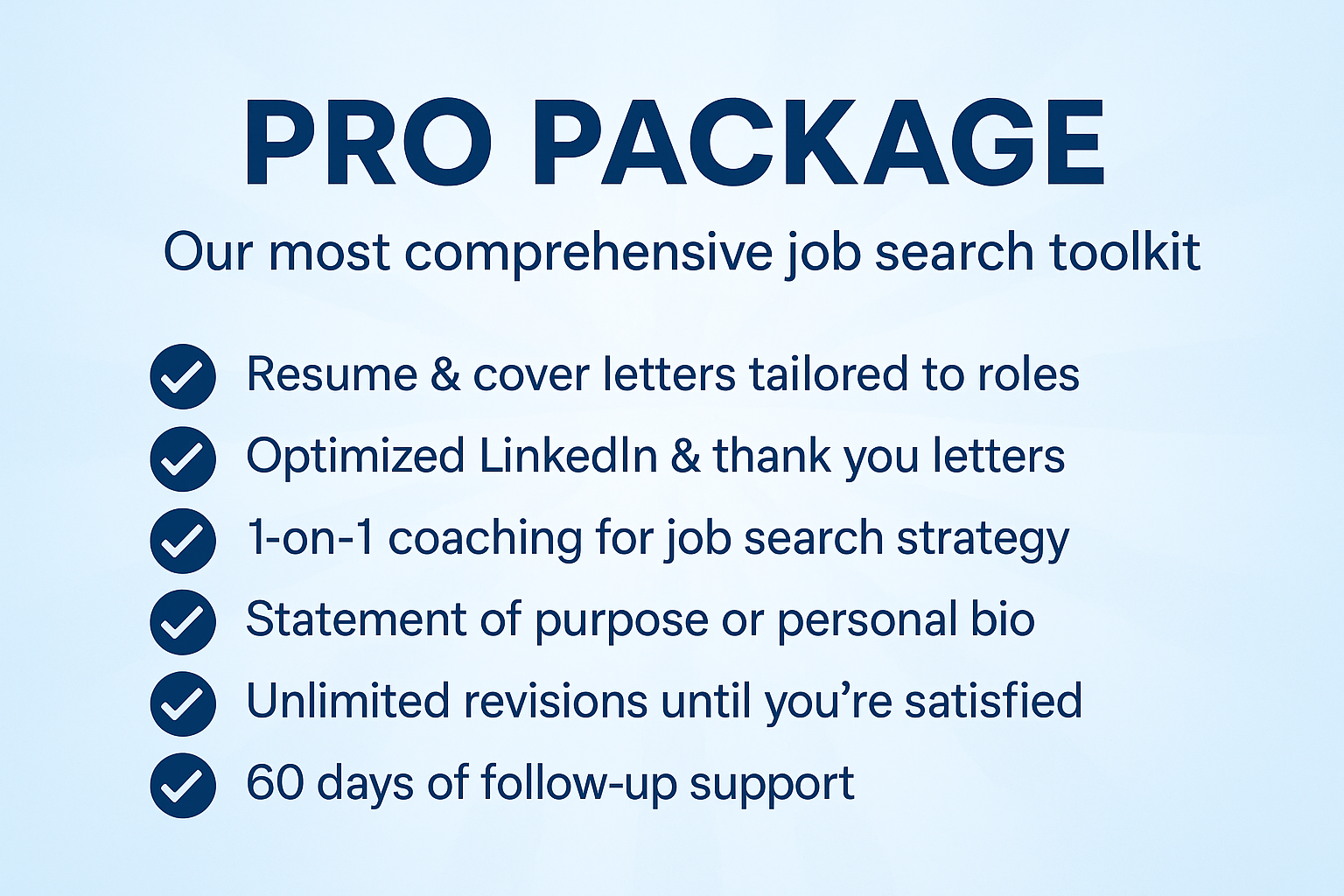 Each package includes a professionally written, ATS-optimized resume tailored to your experience level. The Pro and Elite packages also include our exclusive ATS Optimization Checklist to help you understand how your resume performs in real-world hiring systems. See our pricing section for full details.